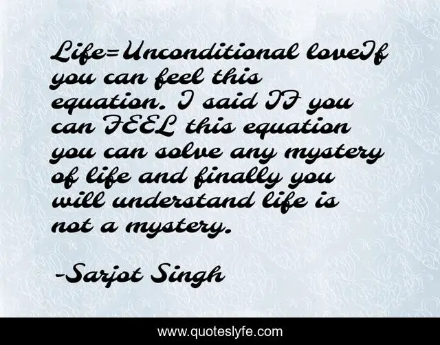 This page presents the quote "Life=Unconditional loveIf you can feel this equation. I said IF you can FEEL this equation you can solve any mystery of life and finally you will understand life is not a mystery.". Author of this quote is Sarjot Singh. This quote is about life, love, self-belief, life-lessons, selfish-world, human-being, affection, women,.