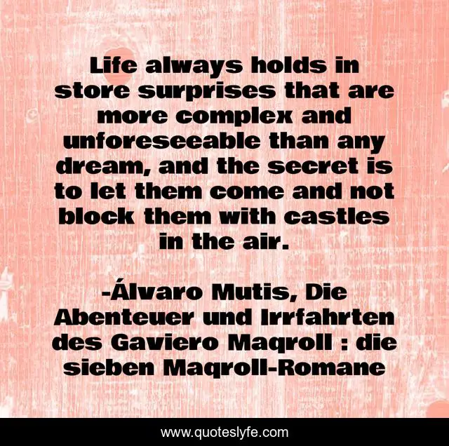 This page presents the quote "Life always holds in store surprises that are more complex and unforeseeable than any dream, and the secret is to let them come and not block them with castles in the air.". Author of this quote is Álvaro Mutis, Die Abenteuer und Irrfahrten des Gaviero Maqroll : die sieben Maqroll-Romane. This quote is about enthusiasm, life, dreams, inspirational,.