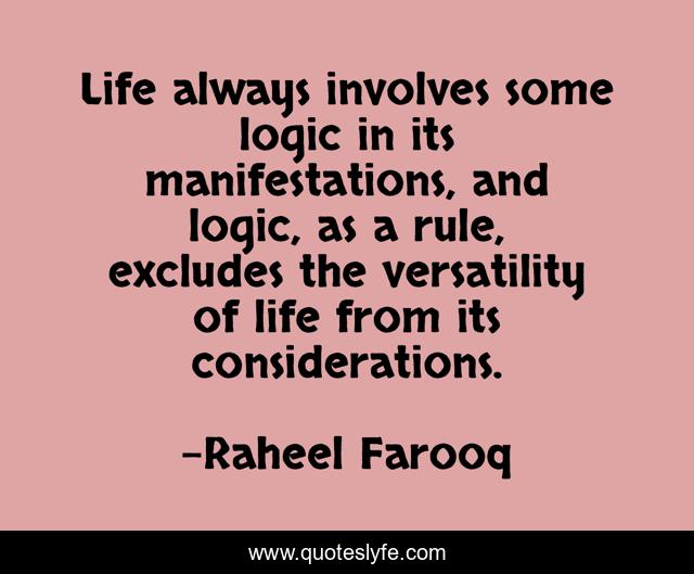 This page presents the quote "Life always involves some logic in its manifestations, and logic, as a rule, excludes the versatility of life from its considerations.". Author of this quote is Raheel Farooq. This quote is about life, philosophy, versatility, logic,.