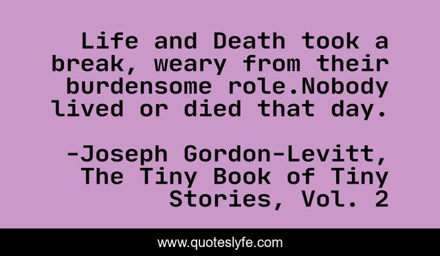 This page presents the quote "Life and Death took a break, weary from their burdensome role.Nobody lived or died that day.". Author of this quote is Joseph Gordon-Levitt, The Tiny Book of Tiny Stories, Vol. 2. This quote is about die, life, death, live,.