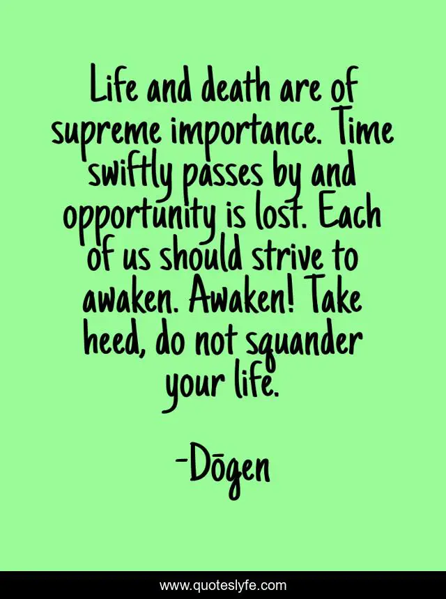 This page presents the quote "Life and death are of supreme importance. Time swiftly passes by and opportunity is lost. Each of us should strive to awaken. Awaken! Take heed, do not squander your life.". Author of this quote is Dōgen. This quote is about awaken, zen, dogen,.