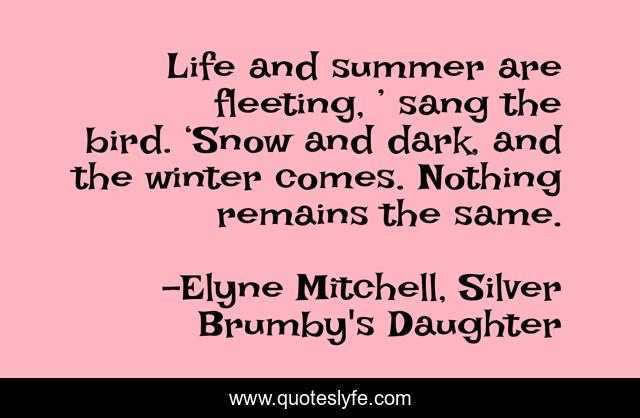 This page presents the quote "Life and summer are fleeting, ’ sang the bird. ‘Snow and dark, and the winter comes. Nothing remains the same.". Author of this quote is Elyne Mitchell, Silver Brumby's Daughter. This quote is about summer, life, fleeting, winter, snow, dark, change,.
