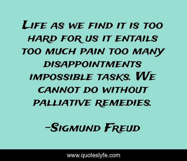 This page presents the quote "Life as we find it is too hard for us it entails too much pain too many disappointments impossible tasks. We cannot do without palliative remedies.". Author of this quote is Sigmund Freud. .