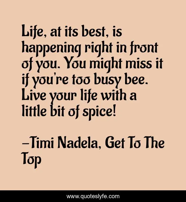 This page presents the quote "Life, at its best, is happening right in front of you. You might miss it if you're too busy bee. Live your life with a little bit of spice!". Author of this quote is Timi Nadela, Get To The Top. .