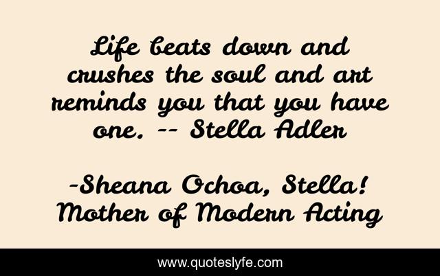 This page presents the quote "Life beats down and crushes the soul and art reminds you that you have one. -- Stella Adler". Author of this quote is Sheana Ochoa, Stella! Mother of Modern Acting. This quote is about lee-strasberg, robert-de-niro, stella-adler, marlon-brando, method-acting, biography,.