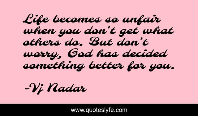 This page presents the quote "Life becomes so unfair when you don't get what others do. But don't worry, God has decided something better for you.". Author of this quote is Vj Nadar. This quote is about life, get, god, unfair, inspirational, others, enthusiasm, worry,.