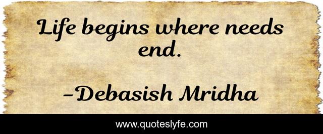 This page presents the quote "Life begins where needs end.". Author of this quote is Debasish Mridha. This quote is about needs, philosophy, debasish-mridha, quotes, where-life-begins, life-begins-where-needs-end, inspirational, enthusiasm, debasish-mridha-m-d,.