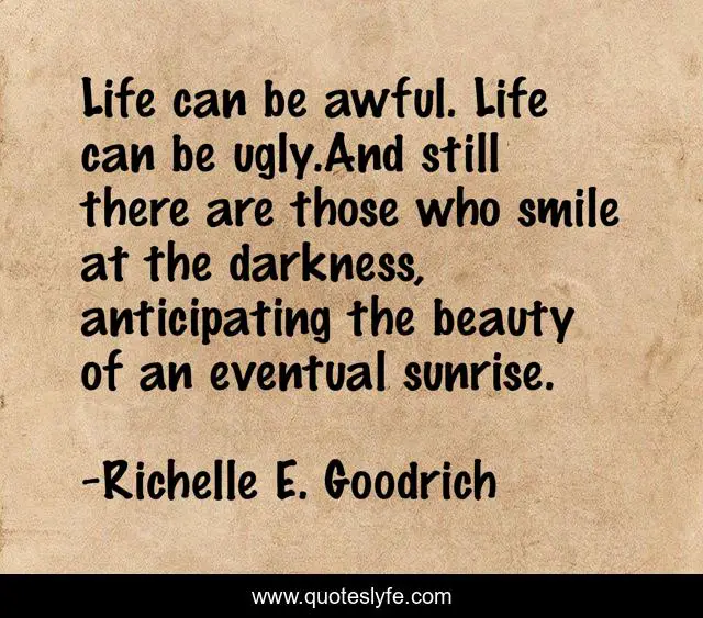 This page presents the quote "Life can be awful. Life can be ugly.And still there are those who smile at the darkness, anticipating the beauty of an eventual sunrise.". Author of this quote is Richelle E. Goodrich. This quote is about gratitude, faith, life, positive-outlook, richelle-e-goodrich, thanksgiving, hopefulness, richelle, positive-thoughts,.
