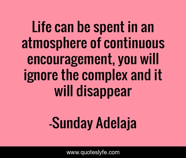 This page presents the quote "Life can be spent in an atmosphere of continuous encouragement, you will ignore the complex and it will disappear". Author of this quote is Sunday Adelaja. This quote is about atmosphere, goal, life, calling, complex, purpose, spent, mission, disappear,.