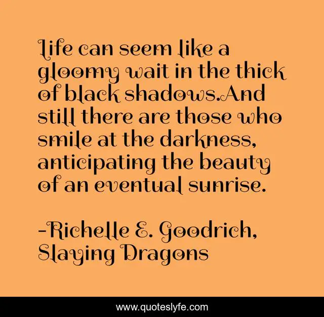 This page presents the quote "Life can seem like a gloomy wait in the thick of black shadows.And still there are those who smile at the darkness, anticipating the beauty of an eventual sunrise.". Author of this quote is Richelle E. Goodrich, Slaying Dragons. This quote is about life, anticipation, richelle-e-goodrich, outlook, optimism, behaviour, attitude, richelle, perspective,.