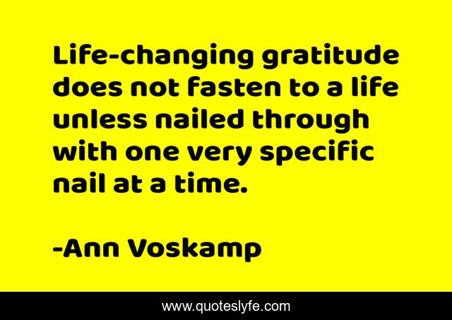 This page presents the quote "Life-changing gratitude does not fasten to a life unless nailed through with one very specific nail at a time.". Author of this quote is Ann Voskamp. .