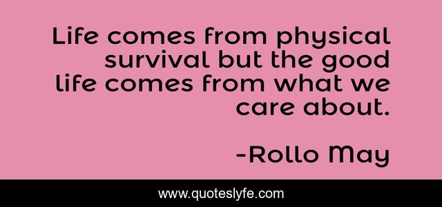 This page presents the quote "Life comes from physical survival but the good life comes from what we care about.". Author of this quote is Rollo May. This quote is about life, survival, good life,.