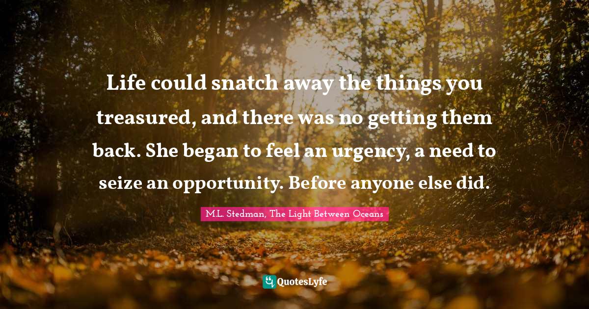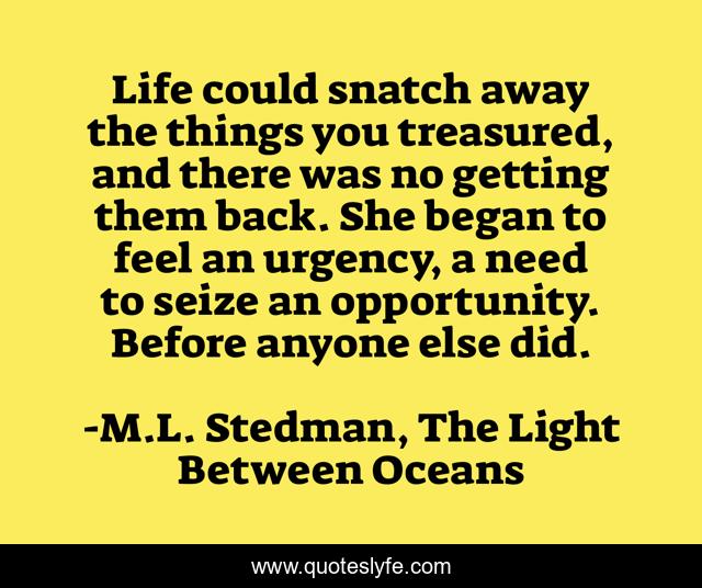 This page presents the quote "Life could snatch away the things you treasured, and there was no getting them back. She began to feel an urgency, a need to seize an opportunity. Before anyone else did.". Author of this quote is M.L. Stedman, The Light Between Oceans. This quote is about life, oceans, treasure, seize-the-day, opportunity, war,.