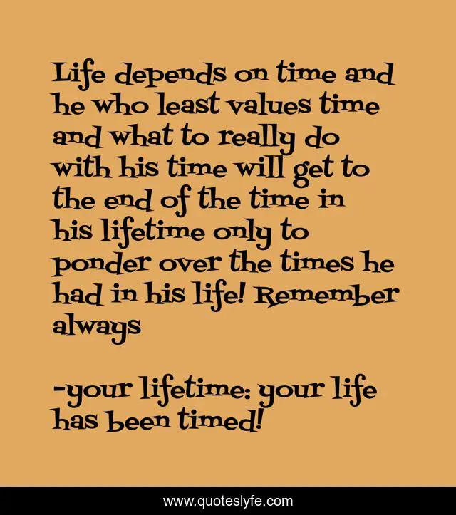This page presents the quote "Life depends on time and he who least values time and what to really do with his time will get to the end of the time in his lifetime only to ponder over the times he had in his life! Remember always". Author of this quote is your lifetime: your life has been timed!. .
