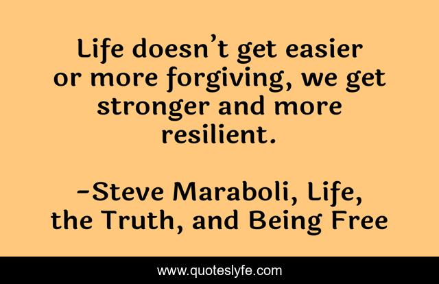 This page presents the quote "Life doesn’t get easier or more forgiving, we get stronger and more resilient.". Author of this quote is Steve Maraboli, Life, the Truth, and Being Free. This quote is about life, strength, inspirational, enthusiasm, forgiveness, resilience,.