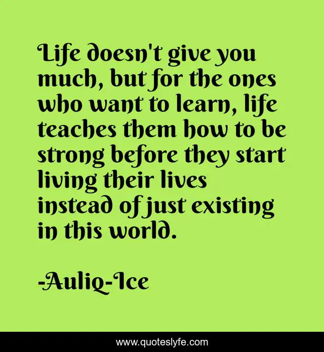 This page presents the quote "Life doesn't give you much, but for the ones who want to learn, life teaches them how to be strong before they start living their lives instead of just existing in this world.". Author of this quote is Auliq-Ice. This quote is about life, learning-from-mistakes, mistakes-in-life, learning-from-others, life-purpose, failure, life-lessons, life-struggles, life-challenges,.
