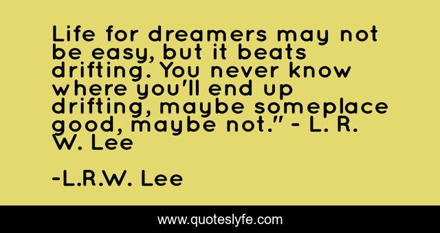 This page presents the quote "Life for dreamers may not be easy, but it beats drifting. You never know where you'll end up drifting, maybe someplace good, maybe not." - L. R. W. Lee". Author of this quote is L.R.W. Lee. This quote is about life-lesson, life-philosophy, life-experience,.