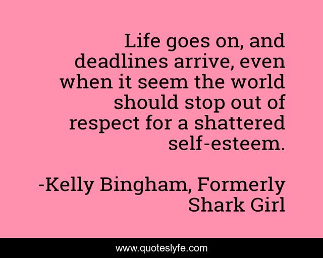 This page presents the quote "Life goes on, and deadlines arrive, even when it seem the world should stop out of respect for a shattered self-esteem.". Author of this quote is Kelly Bingham, Formerly Shark Girl. .
