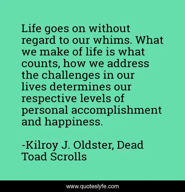 This page presents the quote "Life goes on without regard to our whims. What we make of life is what counts, how we address the challenges in our lives determines our respective levels of personal accomplishment and happiness.". Author of this quote is Kilroy J. Oldster, Dead Toad Scrolls. This quote is about meaningful-life, personal-achievement, happiness,.