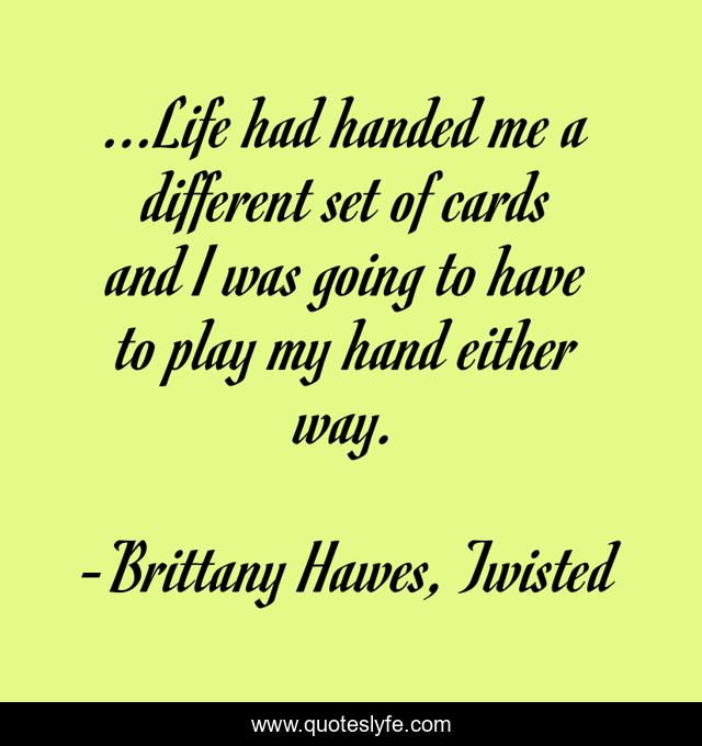 This page presents the quote "...Life had handed me a different set of cards and I was going to have to play my hand either way.". Author of this quote is Brittany Hawes, Twisted. This quote is about life, inspirational, life-philosophy, brittany-hawes, science, twisted, science-fiction, fiction, ya,.