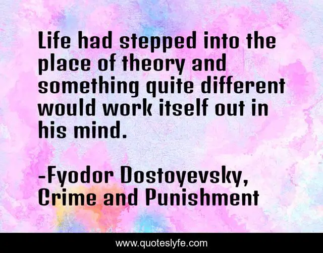 This page presents the quote "Life had stepped into the place of theory and something quite different would work itself out in his mind.". Author of this quote is Fyodor Dostoyevsky, Crime and Punishment. This quote is about life, theory, fate, god, universal, mind, soul, thought,.