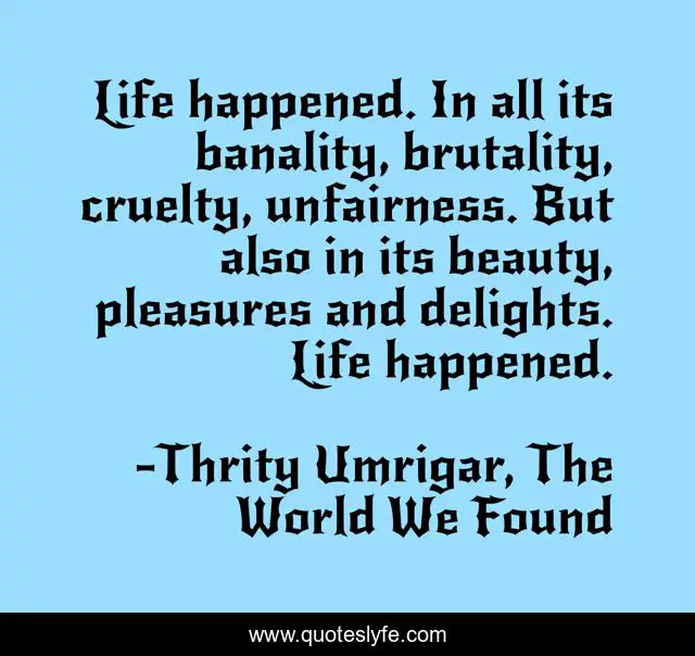 "Thrity Umrigar, The World We Found Quotes." Quoteslyfe.com, 2025. Fri. 05 Dec. 2025. <https://www.quoteslyfe.com/quote/Life-happened-In-all-its-banality-brutality-116567>.