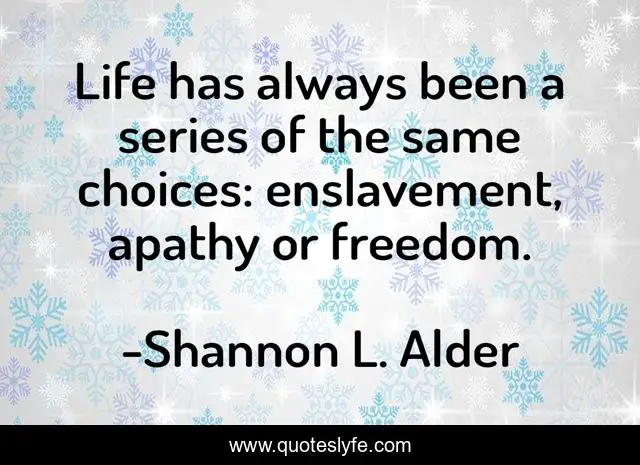 This page presents the quote "Life has always been a series of the same choices: enslavement, apathy or freedom.". Author of this quote is Shannon L. Alder. This quote is about lessons, life, freedom, apathy, choices, enslavement, repetition, decisions,.