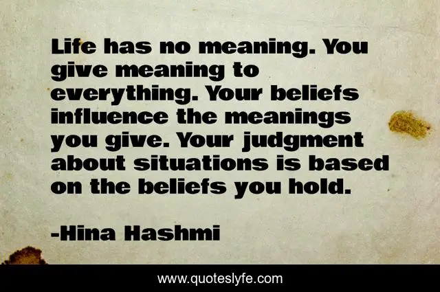 This page presents the quote "Life has no meaning. You give meaning to everything. Your beliefs influence the meanings you give. Your judgment about situations is based on the beliefs you hold.". Author of this quote is Hina Hashmi. This quote is about meaning-in-life, beliefs, thoughts-on-life,.