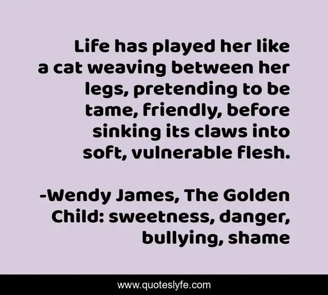 This page presents the quote "Life has played her like a cat weaving between her legs, pretending to be tame, friendly, before sinking its claws into soft, vulnerable flesh.". Author of this quote is Wendy James, The Golden Child: sweetness, danger, bullying, shame. This quote is about betrayed, life, life-lessons,.