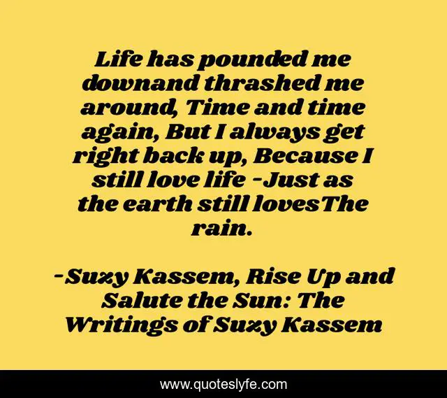 This page presents the quote "Life has pounded me downand thrashed me around, Time and time again, But I always get right back up, Because I still love life -Just as the earth still lovesThe rain.". Author of this quote is Suzy Kassem, Rise Up and Salute the Sun: The Writings of Suzy Kassem. This quote is about fall-down, life, pound, love, fall-down-and-get-back-up, endurance, time, rain, strength,.
