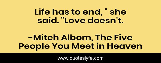 This page presents the quote "Life has to end, " she said. "Love doesn't.". Author of this quote is Mitch Albom, The Five People You Meet in Heaven. This quote is about heven, death-and-dying, fiction,.