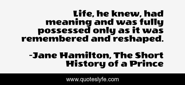 This page presents the quote "Life, he knew, had meaning and was fully possessed only as it was remembered and reshaped.". Author of this quote is Jane Hamilton, The Short History of a Prince. This quote is about life, memory,.