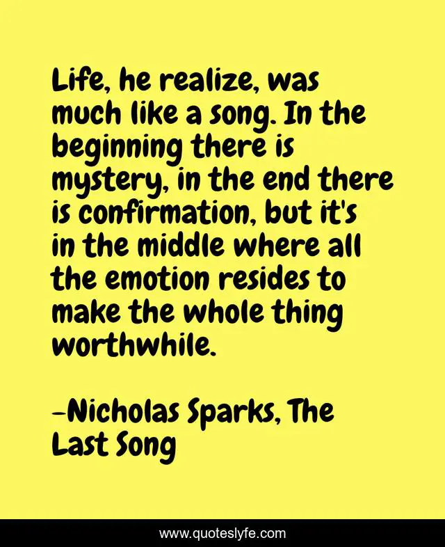 This page presents the quote "Life, he realize, was much like a song. In the beginning there is mystery, in the end there is confirmation, but it's in the middle where all the emotion resides to make the whole thing worthwhile.". Author of this quote is Nicholas Sparks, The Last Song. This quote is about simile, life, love, song, music, affection,.