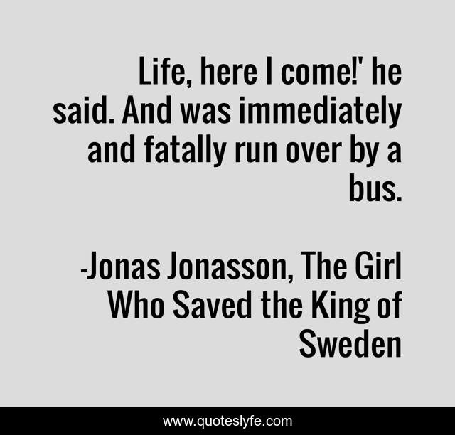 This page presents the quote "Life, here I come!' he said. And was immediately and fatally run over by a bus.". Author of this quote is Jonas Jonasson, The Girl Who Saved the King of Sweden. This quote is about irony, jonas-jonasson, life, fatality, destiny,.