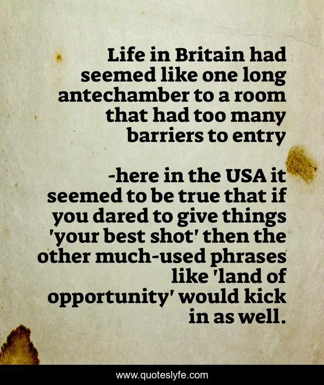 "here in the USA it seemed to be true that if you dared to give things 'your best shot' then the other much-used phrases like 'land of opportunity' would kick in as well. Quotes." Quoteslyfe.com, 2025. Sun. 07 Dec. 2025. <https://www.quoteslyfe.com/quote/Life-in-Britain-had-seemed-like-one-280650>.