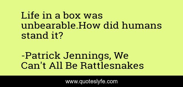 This page presents the quote "Life in a box was unbearable.How did humans stand it?". Author of this quote is Patrick Jennings, We Can't All Be Rattlesnakes. This quote is about box, humans, ethics, reptiles, snakes,.