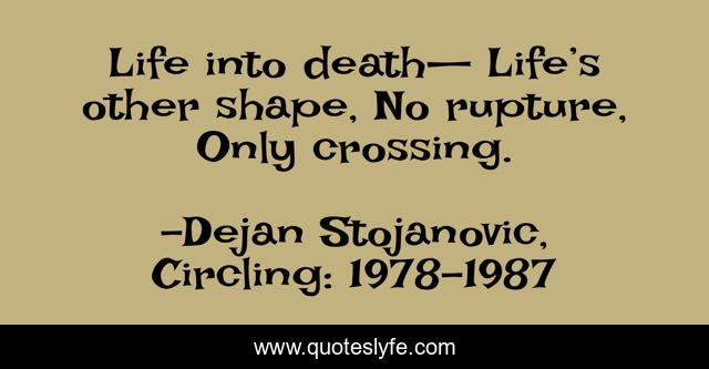 This page presents the quote "Life into death— Life’s other shape, No rupture, Only crossing.". Author of this quote is Dejan Stojanovic, Circling: 1978-1987. This quote is about life, death, dejan-stojanovic, poetry, wisdom, quotes, shape, literature, circling,.