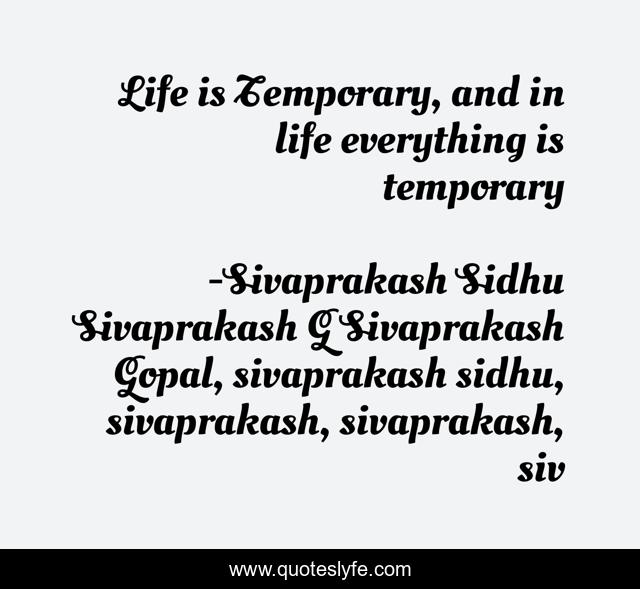 This page presents the quote "Life is Temporary, and in life everything is temporary". Author of this quote is Sivaprakash Sidhu Sivaprakash G Sivaprakash Gopal, sivaprakash sidhu, sivaprakash, sivaprakash, siv. This quote is about life-philosophy, life,.
