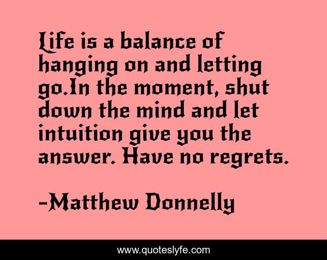 This page presents the quote "Life is a balance of hanging on and letting go.In the moment, shut down the mind and let intuition give you the answer. Have no regrets.". Author of this quote is Matthew Donnelly. This quote is about intuition, shutting-down-mind, letting-go, hanging-on, present-moment, no-regrets,.