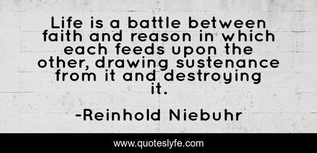 This page presents the quote "Life is a battle between faith and reason in which each feeds upon the other, drawing sustenance from it and destroying it.". Author of this quote is Reinhold Niebuhr. This quote is about battle, life, drawing,.