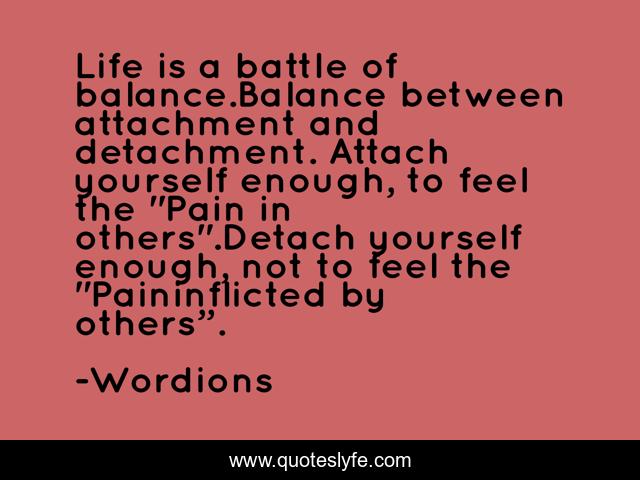 This page presents the quote "Life is a battle of balance.Balance between attachment and detachment. Attach yourself enough, to feel the "Pain in others".Detach yourself enough, not to feel the "Paininflicted by others”.". Author of this quote is Wordions. This quote is about wordions-com, life, pain, wordions, battle-of-balance,.