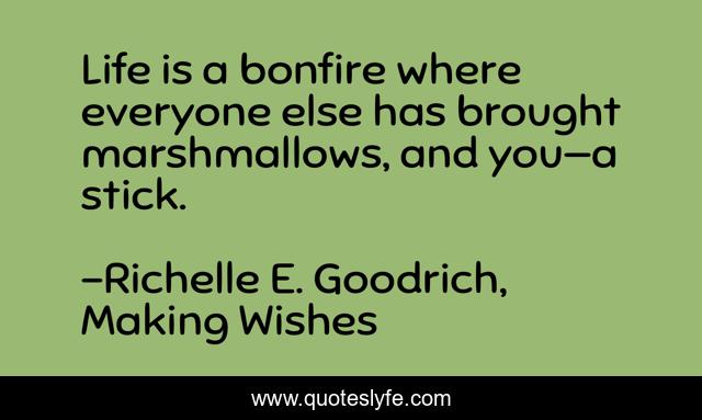 This page presents the quote "Life is a bonfire where everyone else has brought marshmallows, and you—a stick.". Author of this quote is Richelle E. Goodrich, Making Wishes. This quote is about life, richelle-e-goodrich, life-is-like, richelle, marshmallows, richelle-goodrich,.