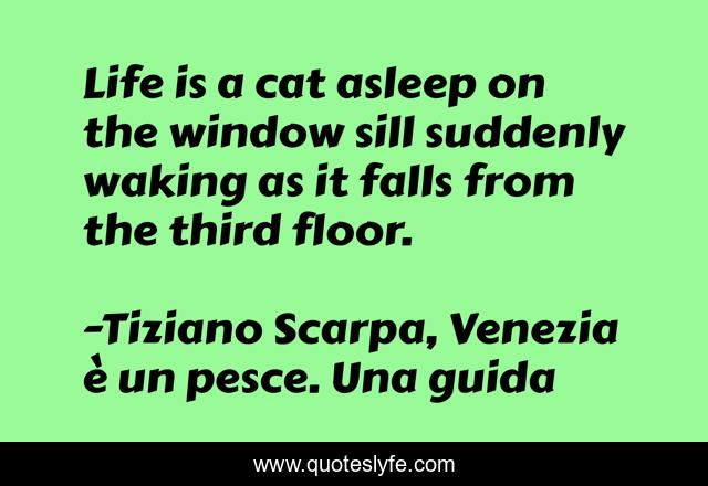 This page presents the quote "Life is a cat asleep on the window sill suddenly waking as it falls from the third floor.". Author of this quote is Tiziano Scarpa, Venezia è un pesce. Una guida. This quote is about life, cats, life-lessons,.