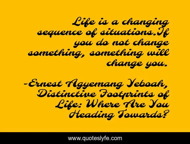 This page presents the quote "Life is a changing sequence of situations.If you do not change something, something will change you.". Author of this quote is Ernest Agyemang Yeboah, Distinctive Footprints of Life: Where Are You Heading Towards?. This quote is about life, brainy, situations, wisdom, purpose, inspirational, enthusiasm, change,.
