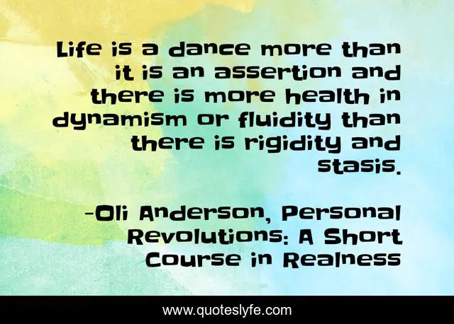 This page presents the quote "Life is a dance more than it is an assertion and there is more health in dynamism or fluidity than there is rigidity and stasis.". Author of this quote is Oli Anderson, Personal Revolutions: A Short Course in Realness. This quote is about life, stasis, flux, mental-health, health, practical-philosophy, growth-mindset, change-management, change,.
