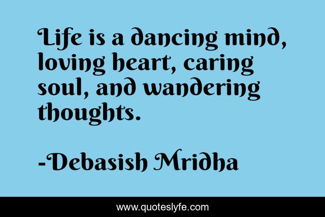 This page presents the quote "Life is a dancing mind, loving heart, caring soul, and wandering thoughts.". Author of this quote is Debasish Mridha. This quote is about life, love, wandering-thoughts, caring-soul, philosophy, debasish-mridha, soul, loving-heart, quotes,.