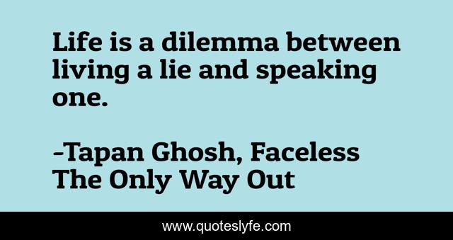 This page presents the quote "Life is a dilemma between living a lie and speaking one.". Author of this quote is Tapan Ghosh, Faceless The Only Way Out. This quote is about life-philosophy, life, life-lessons,.
