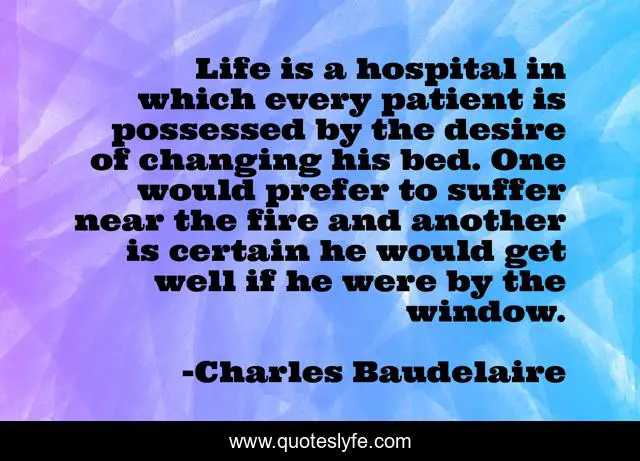 This page presents the quote "Life is a hospital in which every patient is possessed by the desire of changing his bed. One would prefer to suffer near the fire and another is certain he would get well if he were by the window.". Author of this quote is Charles Baudelaire. .