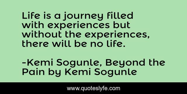 This page presents the quote "Life is a journey filled with experiences but without the experiences, there will be no life.". Author of this quote is Kemi Sogunle, Beyond the Pain by Kemi Sogunle. This quote is about living, life, inspiration, life-inspirational, experiences, life-lessons, life-and-living, life-s-journey,.