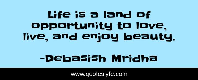 This page presents the quote "Life is a land of opportunity to love, live, and enjoy beauty.". Author of this quote is Debasish Mridha. This quote is about life, love, philosophy, debasish-mridha, land-of-opportunity, quotes, live, inspirational, enthusiasm,.
